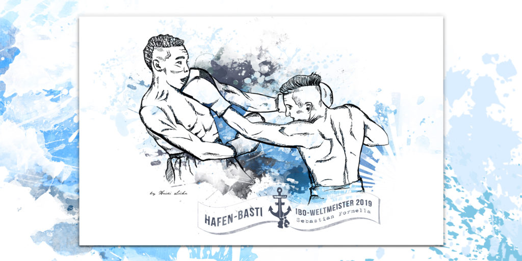 Ibo-Weltmeister Sebastian Formella zum gewonnenen WM-Kampf 2019 gegen Tulani Mbenge. Ein besonders aufregendes Projekt in einem anderen neuen Stil- Illustration einer Szene vom Kampf…auf Gallery Print. Gezeichnet, coloriert und digitalisiert/Druck auf Gallery Print www.sebastian-formella.dewww.facebook.com/HafenBasti/